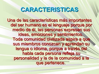 El documento destaca la importancia del lenguaje en nuestras vidas como una característica fundamental del ser humano para expresar ideas, emociones y sentimientos. Señala que el lenguaje refleja la personalidad individual y de la comunidad a la que pertenecemos. Resalta la necesidad de priorizar la enseñanza del lenguaje en todos los niveles para formar ciudadanos cultos e informados. Finalmente, reconoce falencias actuales en el uso correcto del lenguaje debido a factores como el uso inadecuado de Internet y propone la lectura