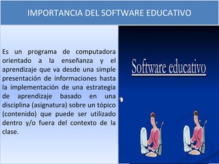 El documento describe la importancia del software educativo en el aprendizaje. Explica que el software educativo es un programa de computadora diseñado para la enseñanza y el aprendizaje que puede ser utilizado dentro o fuera del aula. También destaca las ventajas del software educativo como la capacidad de adaptarse al ritmo de cada estudiante y facilitar la interacción, así como las desventajas como la posible distracción y falta de control de calidad. Finalmente, resume las principales características del software educativo como su enfoque didáctico, capacidad