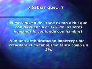 Este documento describe 11 indicaciones de que el cuerpo puede estar deshidratado y los beneficios de beber más agua, incluyendo la prevención de cáncer, artritis, dolor de espalda, angina, migraña y más. Se recomienda beber al menos 8 vasos de agua al día para mantener una buena salud y prevenir enfermedades. Una adecuada hidratación puede aliviar muchos problemas de salud.