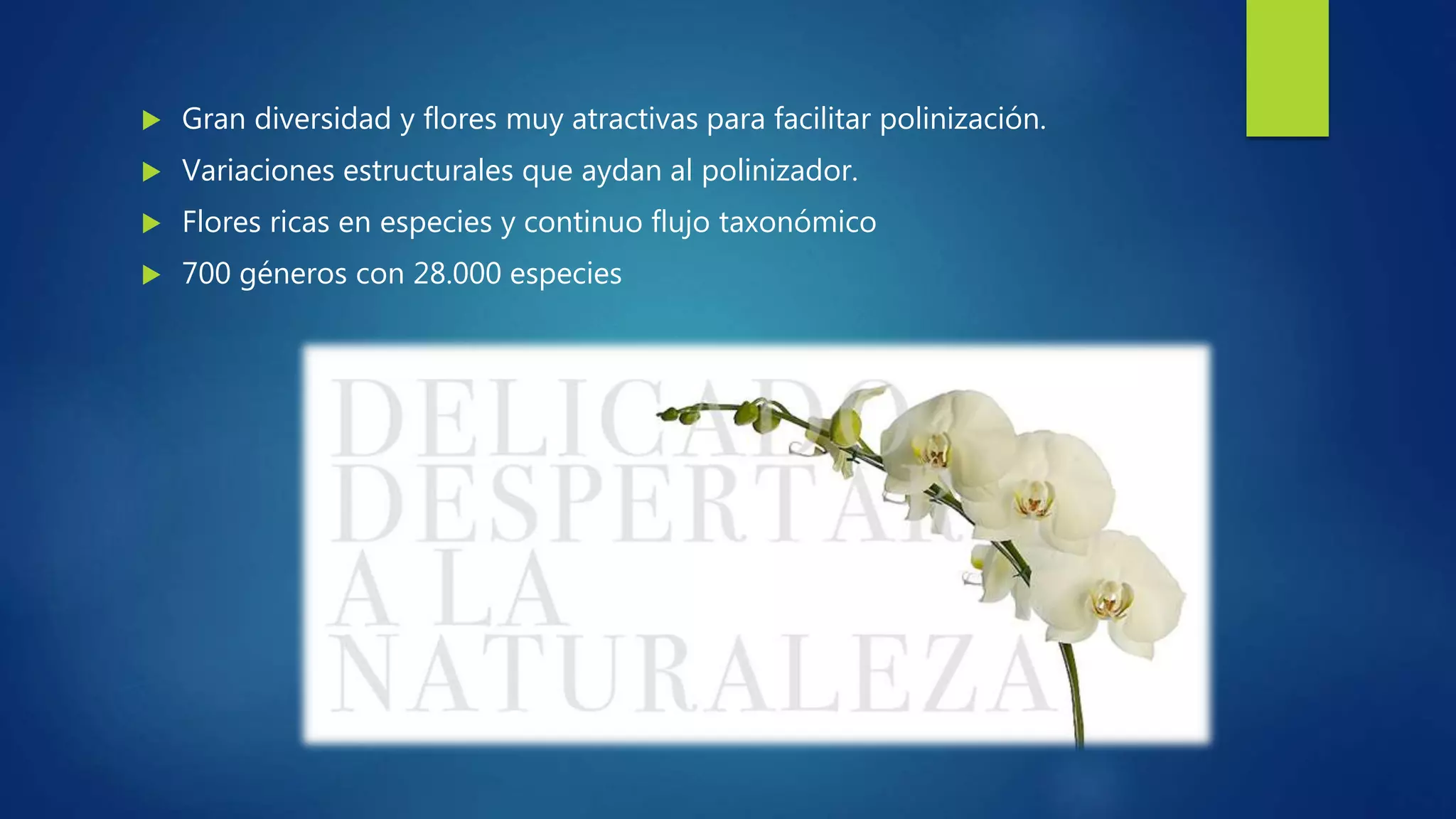 Este documento describe las orquídeas, una familia de plantas con gran diversidad de flores atractivas para la polinización. Discuten su importancia ecológica como colonizadoras de diversos hábitats y su capacidad de adaptación. También destaca su importancia económica como plantas ornamentales cultivadas y comercializadas a nivel mundial, así como el uso de la vainilla como especia.