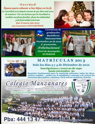 La Navidad es una época para educar a los hijos en la fe y celebrar la cercanía de Dios con la humanidad. Es también una fiesta familiar que promueve la solidaridad y fraternidad universal. El documento anuncia las fechas para la matrícula del próximo año escolar y los requisitos para inscribirse, incluyendo presentar documentos requeridos y encuestas para padres y estudiantes.