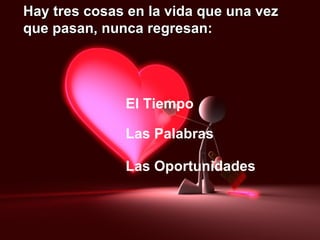 El documento presenta una serie de afirmaciones sobre aspectos valiosos y peligrosos de la vida, incluyendo el tiempo, las palabras, las oportunidades, el enojo, el orgullo, la esperanza, la paz, la honestidad, el amor, la familia, la bondad, la fortuna, el éxito, los sueños, el compromiso, la sinceridad y el trabajo duro. También menciona la santísima trinidad y pide a Dios que bendiga y guíe a quien reciba el mensaje.