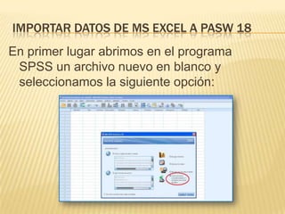 El documento describe los pasos para importar datos de Microsoft Excel a SPSS 18. Estos pasos incluyen abrir un nuevo archivo en blanco en SPSS, seleccionar la opción para importar archivos de Excel, buscar y seleccionar el archivo de Excel, eliminar variables seleccionadas, y finalmente ver los datos y variables importados en SPSS.