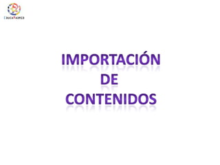 Este documento describe cómo importar contenidos creados en otras plataformas al nuevo portal. Los usuarios pueden importar archivos en diferentes formatos como .zip pulsando "Importar" en el administrador de contenidos y seleccionando el archivo, y el sistema creará el contenido correspondiente en función del tipo de archivo importado.