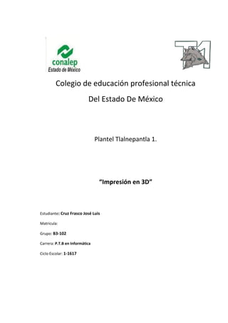 Este documento describe la tecnología de impresión 3D, incluyendo las tres principales técnicas (FDM, SLA, SLS) y cómo funciona específicamente la técnica FDM usando un hilo de plástico calentado depositado en capas. También define conceptos clave como fabricación aditiva, prototipado rápido y los materiales comúnmente usados como ABS y PLA.