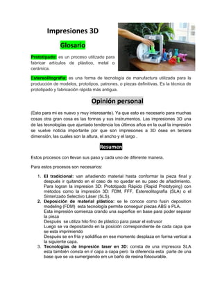Este documento describe los procesos de impresión 3D. Explica que el prototipado y la estereolitografía son técnicas antiguas de fabricación rápida que se utilizan para producir modelos y prototipos. Luego resume tres métodos comunes de impresión 3D: 1) la deposición de material plástico en capas conocida como FDM, 2) el sinterizado selectivo por láser que usa polvo, y 3) las tecnologías de impresión láser que funcionan sumergiendo una base en un baño de resina f
