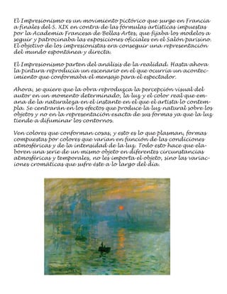 El Impresionismo surgió en Francia a finales del siglo XIX en contra de las convenciones académicas. Los impresionistas buscaban representar espontáneamente la luz y el color tal como los percibía el artista en un momento dado, en lugar de reproducir formas de manera exacta. Figuras clave como Monet, Renoir, Degas y otros pintaron paisajes, escenas callejeras y retratos usando pinceladas sueltas de color puro y capturando efectos de la luz.