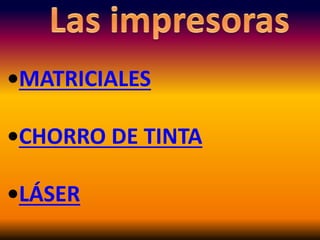 Este documento describe tres tipos de impresoras: impresoras matriciales, impresoras de chorro de tinta e impresoras láser. Las impresoras matriciales imprimen mediante el impacto de una cinta de tinta contra el papel de forma similar a una máquina de escribir y sólo son adecuadas para imprimir texto de baja calidad. Las impresoras de chorro de tinta expulsan gotas de tinta líquida a través de inyectores para formar puntos en el papel e imprimir gráficos y