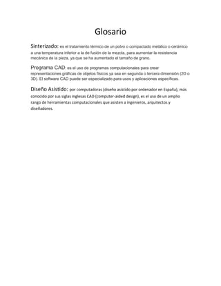Este documento explica qué es una impresora 3D. Describe que una impresora 3D puede imprimir figuras tridimensionales a partir de diseños de computadora creando objetos físicos capa por capa. Explica los tres tipos principales de impresoras 3D - adición de polímeros, láser SLA y láser SLS - y cómo cada una funciona depositando o solidificando materiales de forma gradual. También menciona algunos programas y herramientas que permiten crear diseños 3D sin experiencia avanzada en CAD.