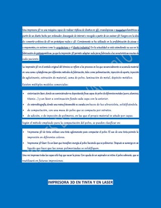Una impresora 3D crea réplicas tridimensionales de diseños digitales mediante la acumulación sucesiva de material en capas. Existen varios métodos como la sinterización láser de polvos metálicos, la estereolitografía de resinas fotopolimerizables y la compactación de polvos. Las impresoras de tinta usan un aglutinante para compactar el polvo, mientras que las de láser polimerizan el polvo con un láser. Las piezas de tinta son más frágiles pero el proceso es más rápid
