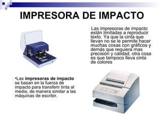 El documento describe diferentes tipos de impresoras, incluyendo impresoras de impacto, de margarita, de línea, matriciales, de inyección de tinta, de sublimación de tinta, de tinta sólida, láser, LED, electrostáticas, de barra, de tambor, braille y térmicas. Cada tipo se distingue por su método de impresión.
