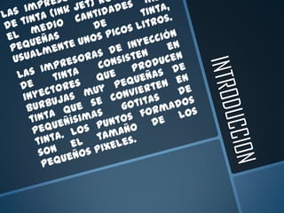 Esta ficha técnica describe una impresora Canon PIXMA IP 2200. Resume que la impresora usa inyección de tinta con una resolución máxima de 4800 x 1200 ppp e imprime hojas de varios tamaños. Explica que la impresora recibe datos de la computadora, los almacena en memoria y usa un cabezal de impresión con cartuchos de tinta para imprimir en hasta 22 ppm en negro y 17 ppm en color.