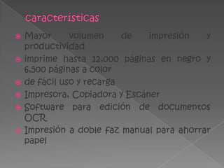 Este documento describe una impresora multifuncional con inyección de tinta que ofrece mayor volumen de impresión y productividad, imprimiendo hasta 12,000 páginas en negro y 6,500 a color. La impresora permite imprimir, copiar y escanear documentos, y viene con software para edición. Además, tiene un costo aproximado de 3,200 pesos iniciales y cada botella de tinta cuesta 150 pesos.