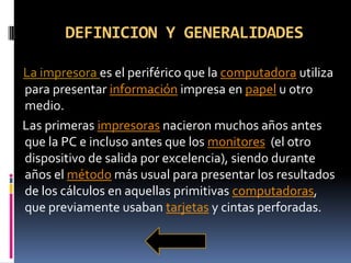 El documento habla sobre diferentes tipos de impresoras, incluyendo sus definiciones, velocidades, memoria, manejo de color y clasificaciones. Explica que las impresoras matriciales imprimen por impacto usando una cinta de tinta, las de inyección de tinta expulsan gotas de tinta sobre el papel, y las láser usan un tambor fotoconductor, tóner y un haz láser para imprimir con alta calidad. También define brevemente los switches como dispositivos de red inteligentes que administran el ancho de band