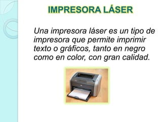 Una impresora láser funciona imprimiendo texto o gráficos en color o negro de alta calidad usando un láser para cargar eléctricamente un tambor y luego transferir pigmentos de color del tóner al papel. Las impresoras de inyección de tinta expulsan gotas de tinta sobre el papel de forma similar a una impresora láser pero a menor costo. Las impresoras matriciales imprimen por impacto oprimiendo una cinta de tinta contra el papel usando diminutos bastones metálicos, de forma