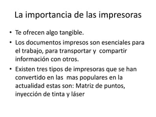 Este documento describe los diferentes tipos de impresoras, incluyendo impresoras de matriz de puntos, de inyección de tinta, láser e impresoras multifunciones. Explica cómo funcionan cada una y sus ventajas y desventajas. También ofrece consejos sobre cómo seleccionar e implementar el mantenimiento de una impresora.
