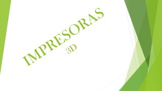 Este documento describe las impresoras 3D, incluyendo su historia, tipos y usos. Una impresora 3D crea objetos tridimensionales a través de la adición de material en capas, a diferencia de los métodos tradicionales que eliminan material. Existen varios tipos como las de tinta, láser e inyección de polímeros. Las impresoras 3D tienen aplicaciones en medicina, arquitectura, educación y uso doméstico.