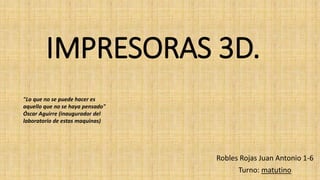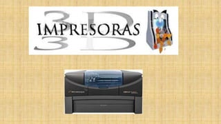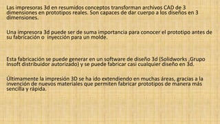 Las impresoras 3D transforman archivos digitales 3D en prototipos físicos mediante la adición de materiales en capas. Son útiles para crear prototipos antes de la fabricación a gran escala y pueden imprimir casi cualquier diseño 3D. Recientemente, su uso se ha extendido a áreas como la medicina, donde se usan para crear prótesis personalizadas.
