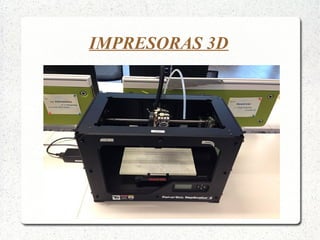 Las impresoras 3D producen objetos tridimensionales a partir de modelos digitales mediante la deposición sucesiva de materiales como plásticos termoplásticos. Existen diferentes tipos de impresoras 3D que funcionan de manera distinta y una variedad de materiales que se pueden utilizar. Las impresoras 3D permiten la fabricación personalizada y reducen costos, aunque también plantean desafíos como la copia no autorizada de objetos protegidos.