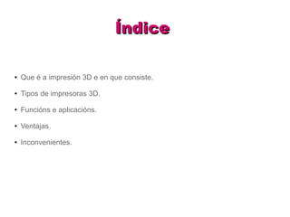 Este documento resume los conceptos básicos de la impresión 3D, incluyendo qué es, cómo funciona, los tipos de impresoras 3D, sus aplicaciones, ventajas e inconvenientes. Describe que la impresión 3D es un proceso aditivo que crea objetos capa a capa y que existen varios tipos de impresoras 3D que utilizan diferentes métodos como la estereolitografía, sinterización selectiva por láser e inyección de material. También menciona aplicaciones como la comida, ropa, partes del cuerpo