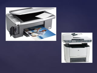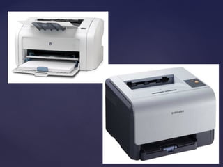 El documento resume la historia y tipos de impresoras. Comienza con una definición de impresora y una breve historia desde la primera impresora eléctrica en 1950 hasta el desarrollo de impresoras láser e inyección de tinta. Luego describe los tipos principales de impresoras como matriciales, de rueda, LED, inyección de tinta, láser y multifuncionales. Finalmente, explica brevemente cómo funcionan las impresoras de inyección de tinta y láser.