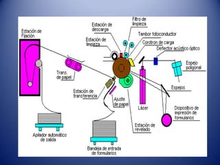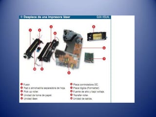 Este documento describe las partes y el funcionamiento de una impresora láser. Explica que una impresora láser utiliza un tambor fotoconductor, un haz láser y tóner para imprimir con alta calidad. También describe los componentes internos como el rodillo revelador, la unidad láser y el ensamble general. Concluye resaltando que una impresora láser debe ser cuidada debido a que sus piezas internas son caras y que imprime con alta resolución y bajo consumo energético.