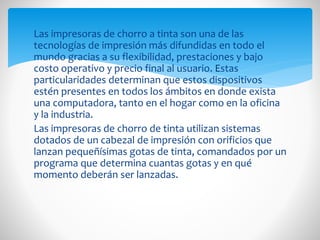 Las impresoras de chorro de tinta son una de las tecnologías de impresión más populares debido a su bajo costo, flexibilidad y rendimiento. Utilizan cabezales de impresión que lanzan pequeñas gotas de tinta controladas por un programa para imprimir imágenes. Funcionan mediante el movimiento coordinado de cartuchos de tinta, cabezales, rodillos y bandejas para transferir la tinta al papel.