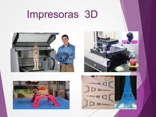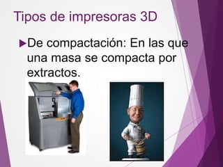 Existen tres tipos principales de impresoras 3D: impresoras de compactación que compactan materiales por capas, impresoras de adición que añaden polímeros capa por capa, e impresoras de estereolitografía que usan un láser ultravioleta para solidificar resinas líquidas en capas. Las impresoras 3D tienen utilidad en la matricería, arquitectura, diseño industrial y reconstrucción de caras u órganos.