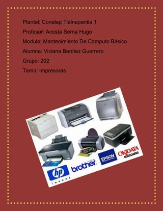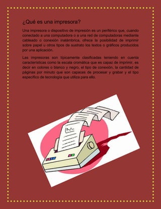 Este documento describe diferentes tipos de impresoras, incluyendo impresoras de matriz de puntos, de chorro de tinta, láser, plotter e inyección. Cada tipo se clasifica según su tecnología de impresión y usos más comunes como comercio, pequeñas oficinas, diseño gráfico e imprenta.