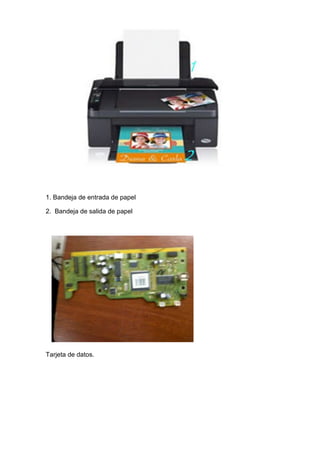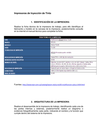 El documento describe el funcionamiento y componentes de las impresoras de inyección de tinta, detallando la identificación de la impresora y su desensamble. Presenta dos tecnologías principales: la de burbuja y la piezoeléctrica, explicando sus procesos de impresión. También se analizan las ventajas y desventajas de estas impresoras en comparación con las láser, destacando su costo, rapidez y mantenimiento.