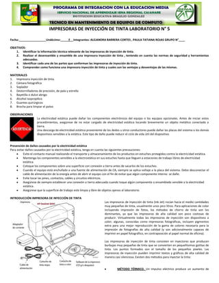 Este documento presenta los objetivos, materiales y observaciones para un laboratorio sobre impresoras de inyección de tinta. Los objetivos incluyen identificar la información técnica de las impresoras, realizar el desensamble y ensamble de una con seguridad, e identificar sus partes. Se enumeran los materiales necesarios como la impresora, destornilladores y guantes. Las observaciones enfatizan la prevención de daños por electricidad estática.