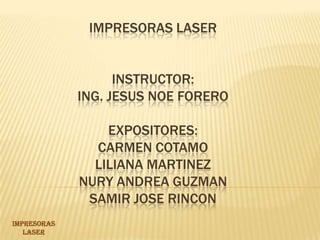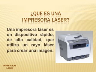 Las impresoras láser utilizan un rayo láser para crear una imagen electrostática latente en un tambor fotosensible, luego aplican tóner para revelar la imagen, la transfieren a papel y la fijan con calor. Funcionan mediante el proceso electrostático de cargar un tambor, exponerlo con un láser para crear una imagen electrostática, revelar la imagen con tóner y transferirla a papel para fijarla con calor. Ofrecen alta calidad de impresión pero tienen mayores costos que otras impresoras