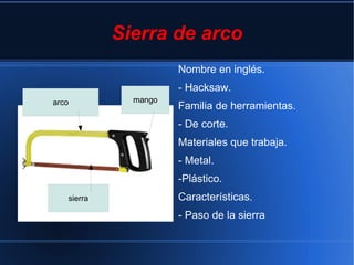 El documento describe las características de varias herramientas de taller comunes como la sierra de arco, el gato, el metro, el martillo y el destornillador. Para cada herramienta se proporciona su nombre en inglés, la familia a la que pertenece, los materiales con los que trabaja y sus características principales.