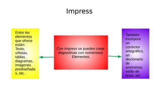 El documento habla sobre cómo crear y compartir diapositivas. Explica que con Impress se pueden crear diapositivas con varios elementos como texto, viñetas, tablas e imágenes. Describe los paneles de tareas, diapositivas y transiciones de diapositivas. También menciona que SlideShare es un sitio donde los usuarios pueden subir y compartir presentaciones de diapositivas de forma pública o privada. Da instrucciones sobre cómo subir una presentación a SlideShare en 7 pasos.