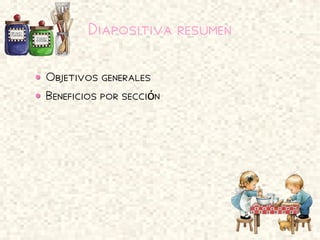 Este documento presenta un resumen de los objetivos y beneficios de un restaurante llamado "Cocina con Ire" en el primer semestre de 2011. El restaurante busca ampliar horizontes, ofrecer el mejor servicio y captar nuevos clientes para ser más competitivos. Generó €57,110 en España y €191,975 en Europa en ese período. La organización incluye un presidente, subdirector, dos directores de cocina y varios jefes. Se analizan los beneficios por sección, gastos y estrategia de revisión para mejorar el