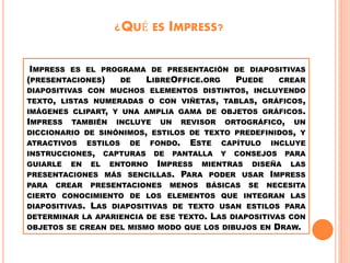 Impress es el programa de presentaciones de diapositivas de LibreOffice. Permite crear diapositivas con texto, listas, tablas, gráficos, imágenes y objetos gráficos. Incluye herramientas de edición como corrector ortográfico, estilos de texto y fondos predefinidos. El documento explica las funciones básicas de Impress para crear presentaciones.