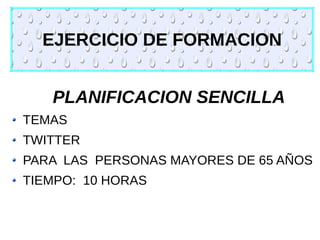 Este documento presenta un plan de formación de 10 horas para enseñar a personas mayores de 65 años a usar Twitter de manera segura, eficaz y responsable. Los objetivos generales son que aprendan a gestionar su cuenta de forma autónoma y participar activamente. Los contenidos incluyen cómo crear una cuenta, retuitear, seguir usuarios, usar hashtags y mensajes directos. Las actividades consisten en ejercicios prácticos como retuitearse, usar hashtags y configurar su perfil. La evaluación comprueba que han aprendido los conceptos clave.