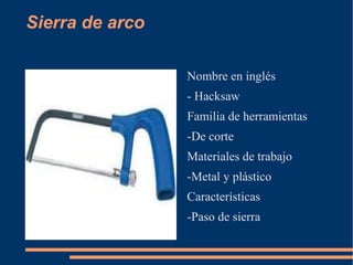 La sierra de arco es una herramienta de corte que utiliza una hoja delgada y flexible para cortar metal y plástico. Funciona mediante el paso de la hoja dentada a través del material, y es una de las herramientas básicas utilizadas para cortar metales.