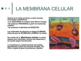 La membrana celular controla el paso de materiales entre la célula y su ambiente. Existen tres tipos de transporte: difusión pasiva, transporte activo y endocitosis/exocitosis. La difusión pasiva incluye difusión simple, difusión facilitada y ósmosis. El transporte activo requiere energía para mover sustancias contra un gradiente de concentración. La endocitosis y exocitosis permiten el transporte de materiales grandes.