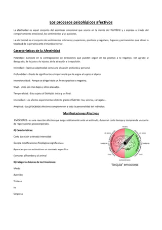 El documento describe varios conceptos relacionados con los procesos psicológicos afectivos. Explica las características de la afectividad y las manifestaciones afectivas como las emociones, sentimientos y pasiones. Describe las emociones básicas como el miedo, la tristeza, la ira y otros conceptos como la fisiología y psicología relacionadas con estas emociones.