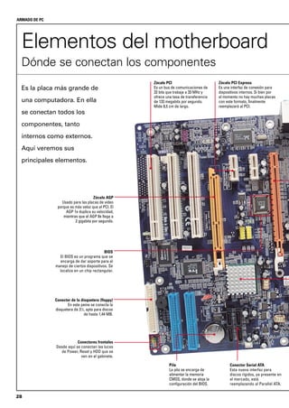 1) El documento describe los componentes principales de una placa madre o motherboard, incluyendo el chipset, los zócalos para el procesador y la memoria RAM, y los puertos de entrada y salida. 2) Explica que el chipset está compuesto por el northbridge y el southbridge, y describe sus funciones. 3) Señala que tanto el northbridge como el southbridge continúan evolucionando para mejorar el rendimiento, integrando más funciones y aumentando la velocidad de comunicación entre componentes.