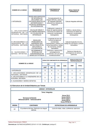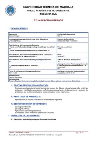 Este documento presenta el syllabus estandarizado para la asignatura de Cálculo Integral en la Universidad Técnica de Machala. La asignatura tiene una carga horaria total de 160 horas distribuidas en 4 unidades didácticas que cubren temas como integrales, aplicaciones generales y aplicaciones a la ingeniería de la integral definida. El objetivo general es proporcionar los conocimientos básicos del cálculo integral y desarrollar habilidades para resolver problemas de ingeniería que involucren el uso de integrales.