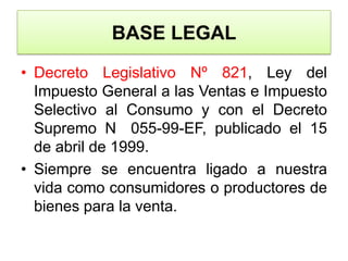 El documento describe el Impuesto General a las Ventas (IGV) en Perú, incluyendo que grava la venta de bienes, servicios e importaciones, pero no actividades como alquiler de viviendas. Explica que los sujetos pasivos son personas naturales y jurídicas y que el impuesto se determina mensualmente deduciendo el crédito fiscal de la base imponible. También cubre requisitos para reclamar el crédito fiscal y la obligación de declarar y pagar el impuesto mensualmente.