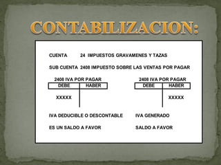 Los impuestos son una fuente importante de ingresos para los gobiernos que usan el dinero para proyectos sociales e inversión. Los impuestos indirectos como el Impuesto al Valor Agregado (IVA) gravan el consumo y se trasladan a los consumidores a través de los precios, mientras que los impuestos directos gravan los ingresos de personas y empresas. El IVA se cobra como un porcentaje del valor de bienes y servicios al momento de su compra, haciendo del IVA un impuesto regresivo que afecta más a los p