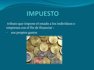El documento describe el sistema tributario en Colombia, incluyendo impuestos directos e indirectos que el estado impone a individuos y empresas para financiar sus gastos y la provisión de servicios. Se detallan impuestos nacionales como el de renta, el IVA y el de timbre, así como impuestos departamentales y distritales que abarcan diversas actividades como el consumo de bebidas y el registro de vehículos. En total, se presentan múltiples tipos de impuestos que son relevantes para la gestión empresarial en el país.
