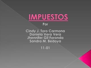 Este documento define los impuestos como una obligación legal para financiar los gastos del Estado sin una contraprestación directa. Explica que los impuestos se pagan de forma equitativa por personas y empresas según su capacidad económica y que son necesarios para financiar servicios públicos como infraestructura, sanidad, educación y protección social. Finalmente, detalla los elementos clave de un impuesto como el hecho imponible, los sujetos pasivos y activos, la base y cuota imponible, y la deuda tributaria resultante.