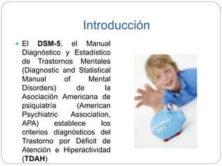 El documento detalla los criterios diagnósticos del trastorno por déficit de atención e hiperactividad (TDAH) según el DSM-5, enfatizando la presentación predominantemente hiperactiva/impulsiva. Se requieren síntomas específicos, evidencias de interferencia en el funcionamiento y presencia de síntomas antes de los 12 años para el diagnóstico. Además, se menciona la necesidad de especificar la gravedad del trastorno y la posibilidad de remisión parcial.