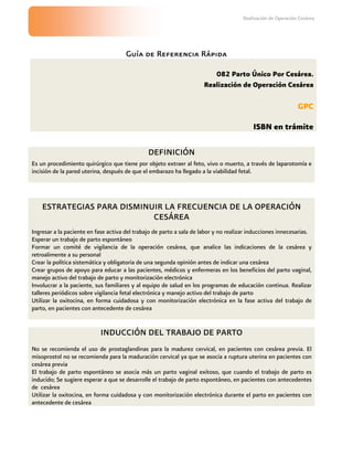 Este documento proporciona información sobre la realización de operaciones cesáreas. Define la cesárea y ofrece estrategias para disminuir su frecuencia, como esperar un trabajo de parto espontáneo. También cubre temas como la inducción del trabajo de parto, pruebas de parto vaginal para pacientes con cesárea previa, el tratamiento del dolor durante el parto, cuidados anestésicos perioperatorios y más. Proporciona indicaciones para cesáreas y criterios de referencia a otros niveles de atención.