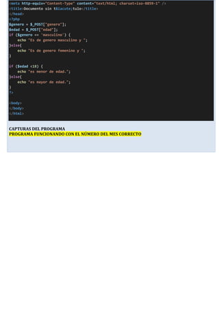 Este informe describe una práctica realizada sobre operadores lógicos en PHP. Los objetivos fueron aprender a utilizar operadores lógicos y variables en PHP, y mejorar la comprensión del lenguaje. Las actividades incluyeron ejercicios para ingresar datos usando radiobuttons y mostrar resultados usando if/else y operadores lógicos. Los resultados incluyeron una mejor comprensión de PHP y el uso de XAMPP y switch case.