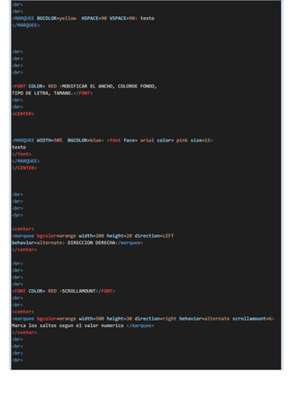 Este informe describe una práctica de HTML sobre el uso de operadores lógicos y marquesinas. Los objetivos eran aprender a usar operadores lógicos, variables y el lenguaje HTML. Las actividades incluyeron crear un programa con marquesinas que muestran texto con diferentes estilos, colores, fuentes y movimientos. El informe concluye que se logró una mejor comprensión de HTML y el uso correcto de operadores lógicos y sentencias básicas.